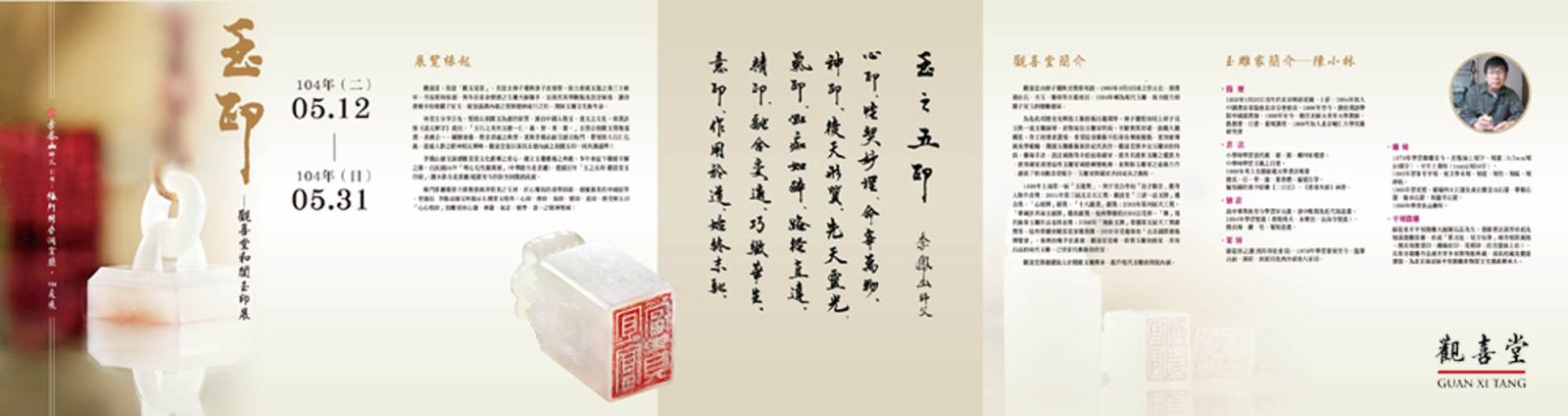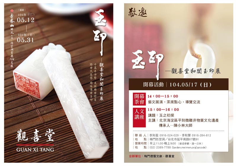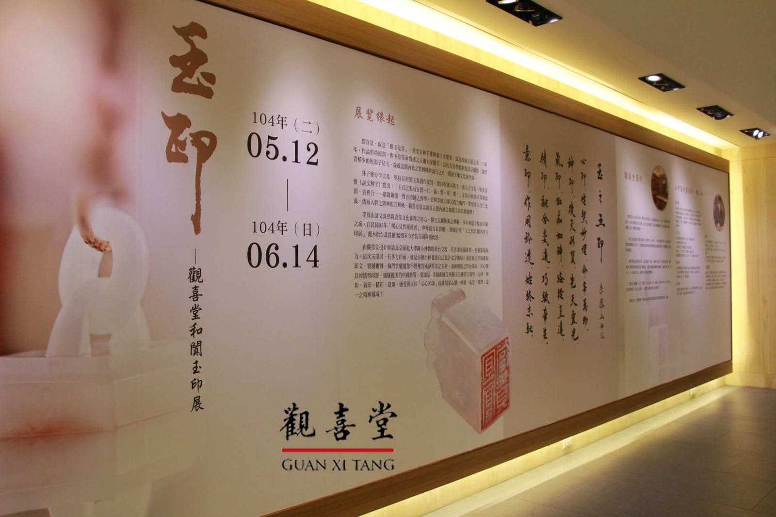 2015年,初夏五月。觀喜堂應梅門德藝文創邀請,於台北梅門防空洞展廳舉辦《觀喜堂和闐玉印展》,展出和闐白玉印章與碧玉印章與印材。中華文化,博大精深,用印文化與習慣傳承數千年。「印章」除為運筆書墨留文字傳千古時的重要夥伴,亦是蒐藏鑑賞時的指標性標記。