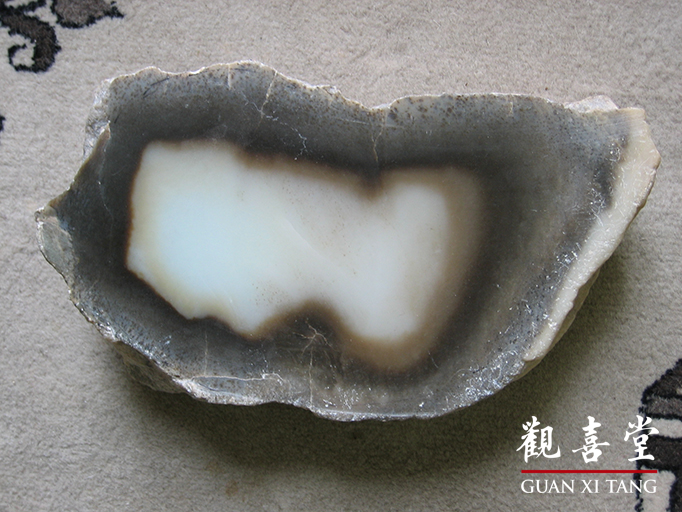 筆者十年前即從事和闐子兒玉原石及玉器加工,從原石選購,經切割剖料,最後設計琢磨而成玉器的過程,累積了不少經驗,以下是我們一般的認知與名詞不同的用法,或許可以提供大家對和闐子兒玉的另一種看法。為何要強調不同用法的名詞呢?譬如說「皮」這個字,凡物體的表面皆可稱為皮,子料的皮為何?山料的皮又為何?為什麼本人將其界定為「子料有皮(圖1)