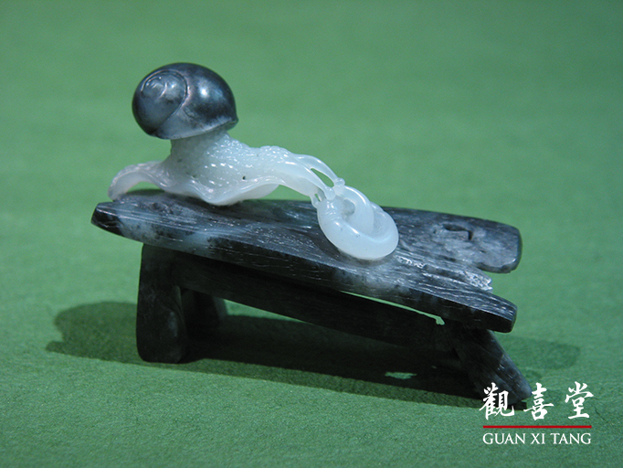 好的子料因為質地細膩,玉器打磨只須以較柔的雅光處理,就能表現出玉質的滋潤凝脂,這種雅光也最適合盤玩;剛完成的玉器外表雖顯不出明亮光度,但卻是內斂中帶着温和的油脂光澤,而隨着時間越盤越油,越盤越潤。(圖8)