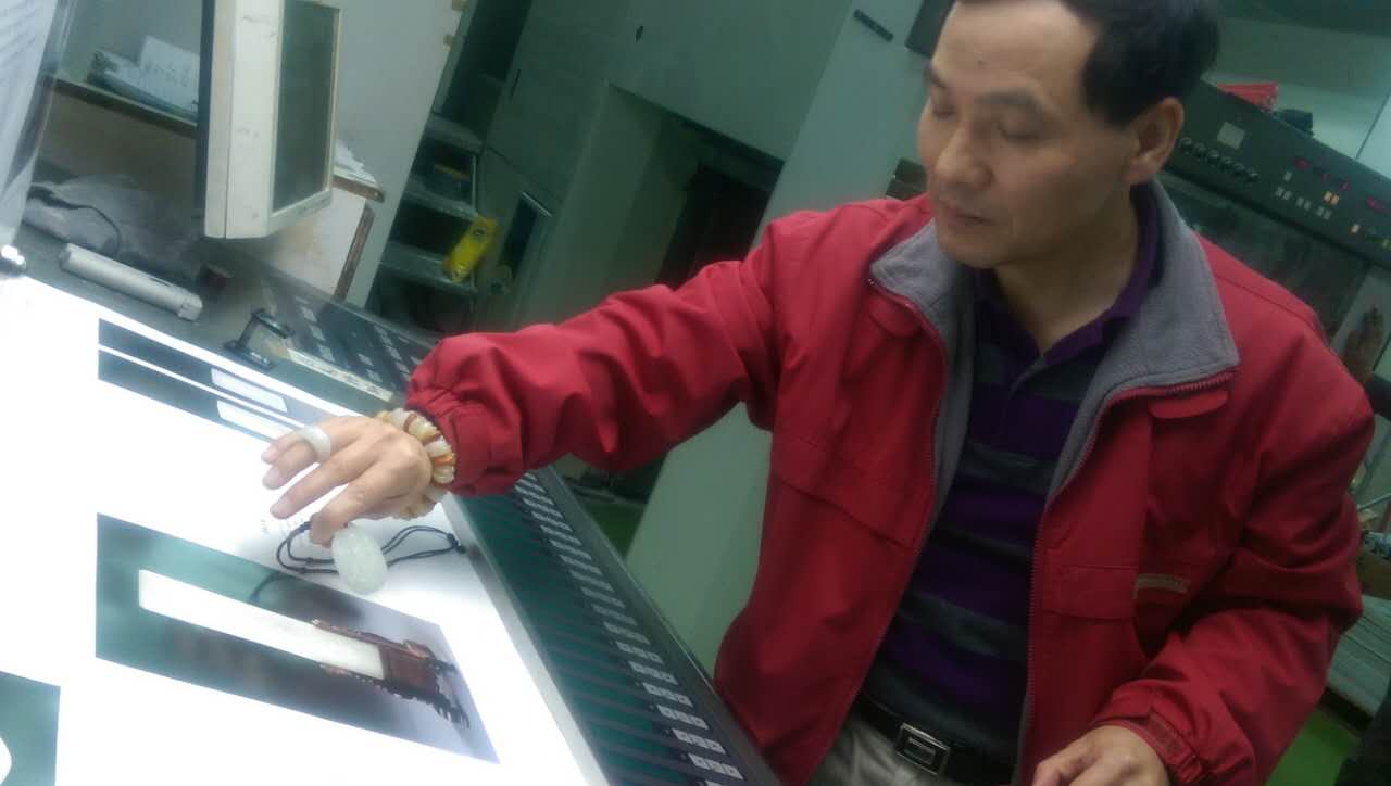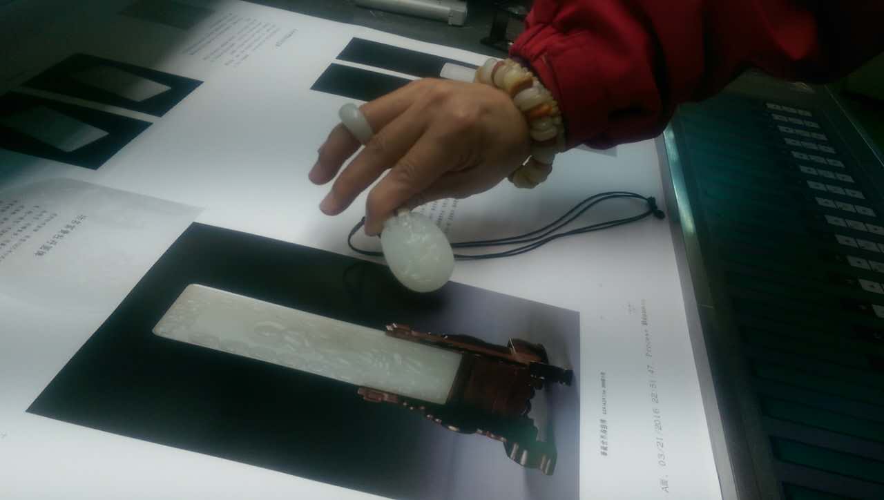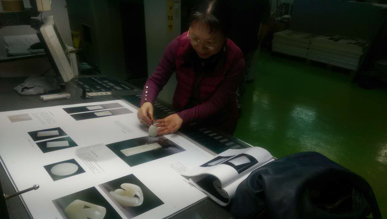 鄒老師一件一件對色,每當打樣出來,又重頭對起。修正了再打樣,再修色,越修越近真實的顏色與玉的潤澤,當然還有對比強度表現出的立體度,最後終於在3月23日付梓印刷。