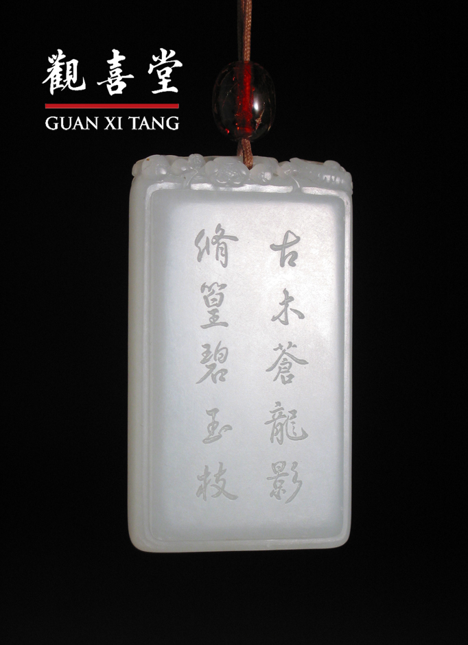 將松與竹構局在牌面中,古梅枝幹用浮雕手法,獨立安排在出廓的牌頂上,盤枝交錯,眾多花朵,點綴其中,有的盛開,有的含苞待放,在小小的空間裡,營造出繁枝茂蕊的盛梅姿態。背面的詩詞和松、竹圖像都是陰刻表現,「天蜀」落款則隱藏在左邊竹葉與松葉之間。