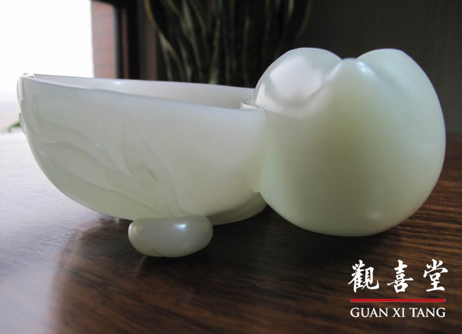 《白玉桃水洗》:自古以來,桃作為福壽吉祥的象徵,《西遊記》書中描寫神仙吃食蟠桃能得長壽。而傳統圖案中的壽星手上總是捧著碩大的桃子,象徵將壽桃獻出予人。對桃子的吉祥崇拜,還有「畫桃畫雙不畫單」的要求,桃越多,壽益長。