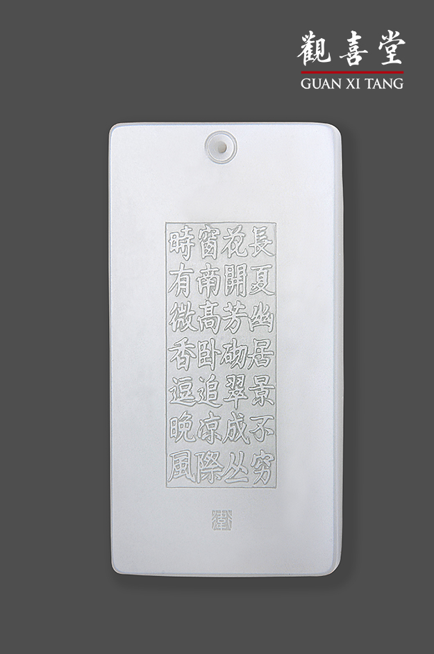 玉牌背面琢以楷書字句:「長夏幽居景不容 花開方砌翠成叢 窗南高臥追涼際 時有微香逗尾風」,描述夏日方晚,美景當前,吹風乘涼,賞花芬芳。