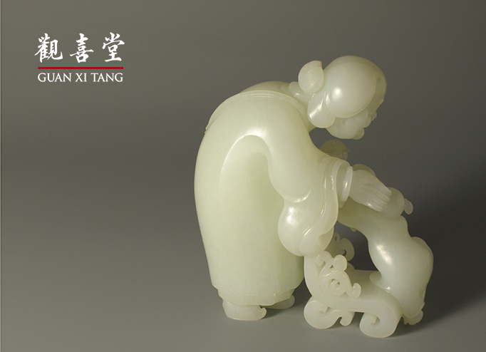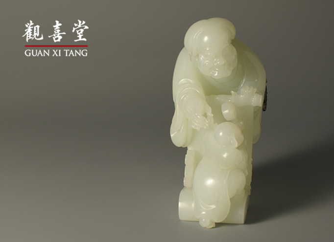 這件作品正是以此悠閒樂事為題,祖母慈祥和藹,彎下軀體,側身撫弄孫兒。稚子天真無邪,足蹬躺椅嬉戲,無拘無束。以和田玉籽料立體圓雕,整件作品構圖和諧,造型精湛,雕琢細緻。衣褶與躺椅上的裝飾也加以著筆刻畫,祖母背囊上以自然皮色雕刻一隻小巧蝙蝠,更富有趣味。