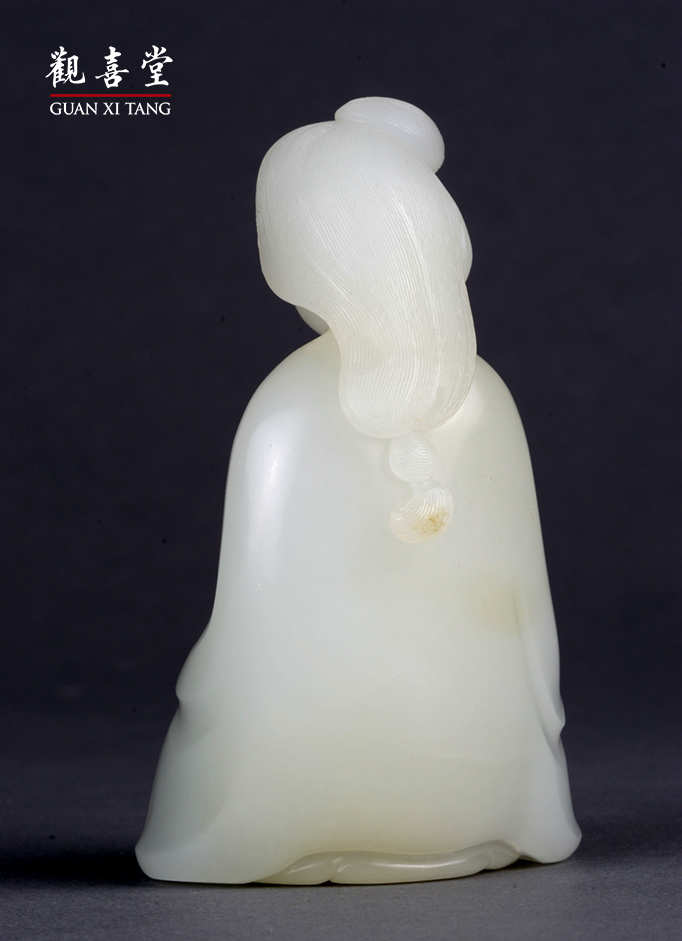 她的五官端正,低眉斂目,面容認真而沈靜,散發出自信與安定。「薄羅衫子透肌膚」,那略顯豐腴的身形,穿著長衫,曲線飽滿自然。纖纖玉手似花蕊,輕輕托著捲軸,正凝神細讀手中書卷,沈思在知與智慧的世界裡,散逸出沈穩的知性美。