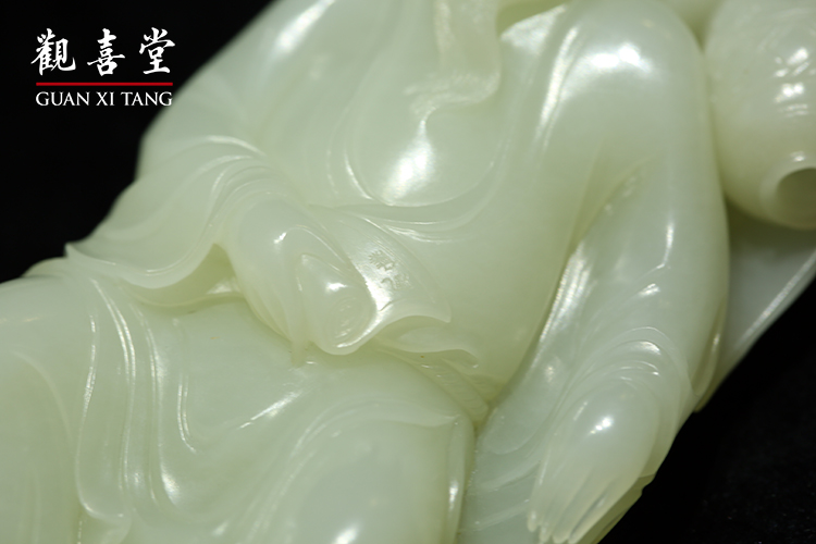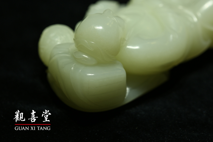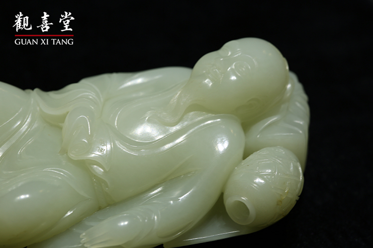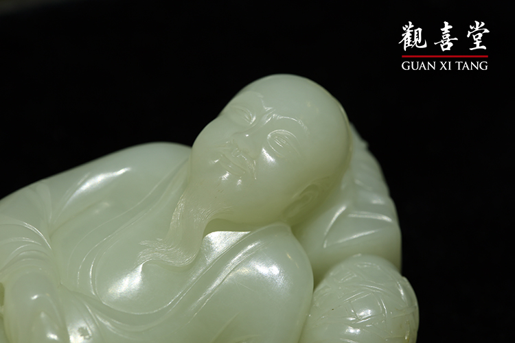 從《醉仙》的表達,即可推知一二,那作為頭枕的書箱,包袱布巾皺摺逼真,書刊也層層疊起。枕旁一甕酒壺,面露笑顏,顯然瓊漿已入腹,十分享受。他手握詩經、寬大敞胸的儒袍,暗示著季節已入春暖時節。