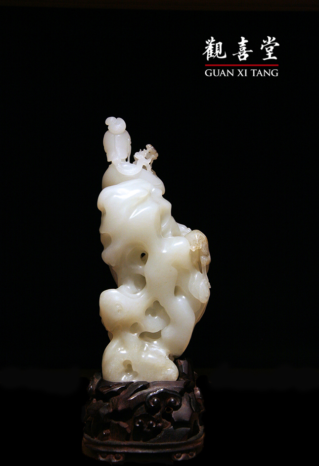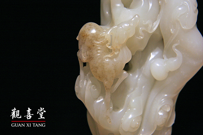 山石右側,利用原石皮色,俏色出一頭梅花鹿,好奇地仰頭望向麻姑,眼神專注柔和。鹿角雙叉極美,蹄子踏於祥雲之上,動態巧然靈活。
