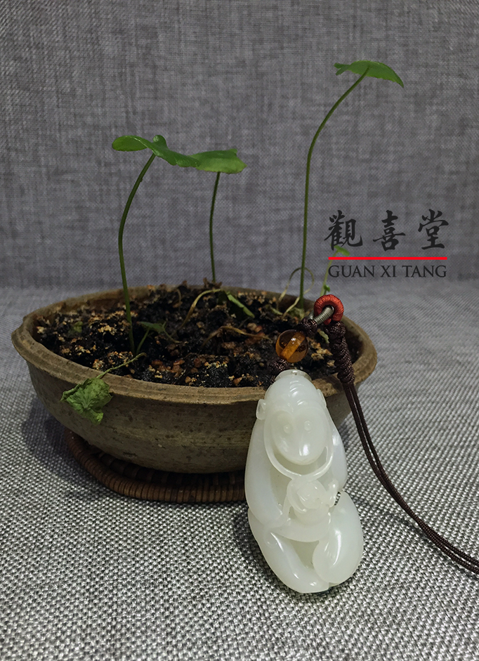 猴通曉人性,與人是物種上的遠房親戚,不但有親子長幼的次序,猴群亦有倫理。本作品中,母猴用手臂輕攬著小猴,凝望的眼神中充滿慈愛;懷中小猴活潑好動,又對母親滿懷依戀。造型圓潤,姿態生動,母子之間洋溢著溫柔情意,母愛無邊,令人觀之倍感溫情。