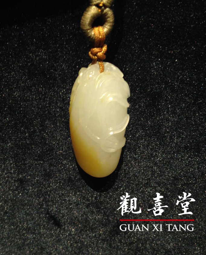 “金獸裊香穗,銀燭燦花枝”。靈巧活潑的小鼠攀於金燦燦的麥穗之上,顯出一片豐收的美好景象。以“鼠”比“數”字,用金穗作為富貴的象徵,表現出招財納福的美好願景。作品用了一塊黃皮籽料,將金穗的顏色表現的淋灕盡致,雕刻手法純熟,線條優美流暢,整體小巧精緻,是一件不可多得的優秀玉雕作品。
