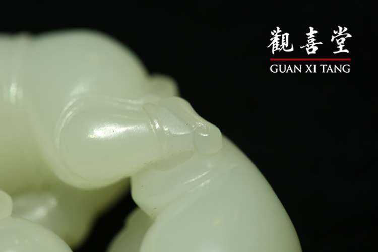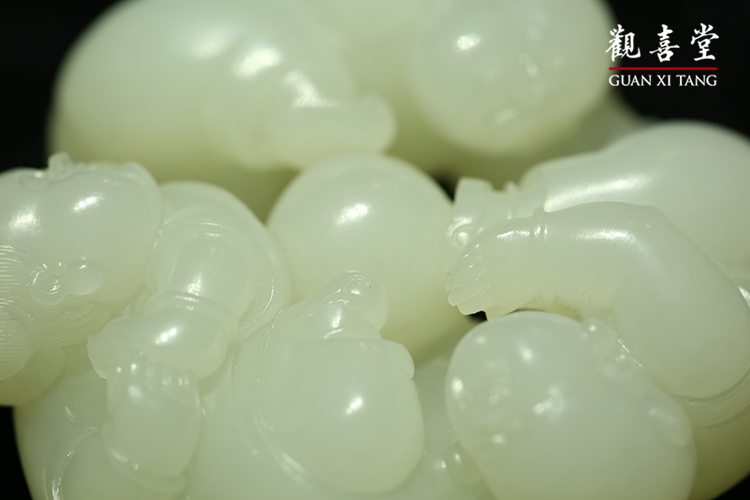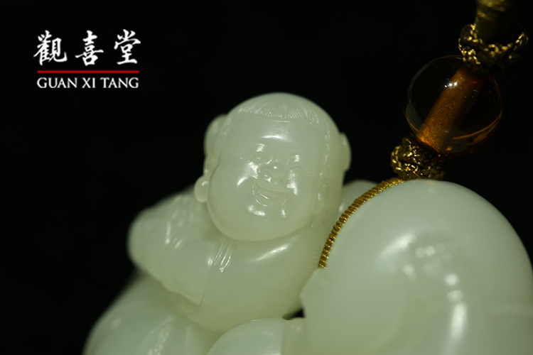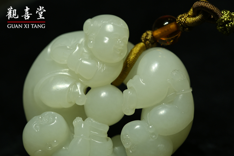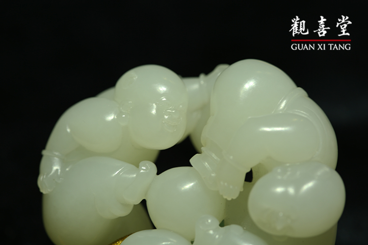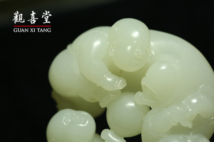 童子天庭飽滿,耳珠垂肩,張嘴呵笑,表情靈活生動。身軀飽滿,仨人的衣著,有著長袖衫、亦有穿著背心,露出一雙藕臂。從髮絲到手鐲、從褲腰到布鞋,造型各不相同,圓墩墩的體型甚是討喜。