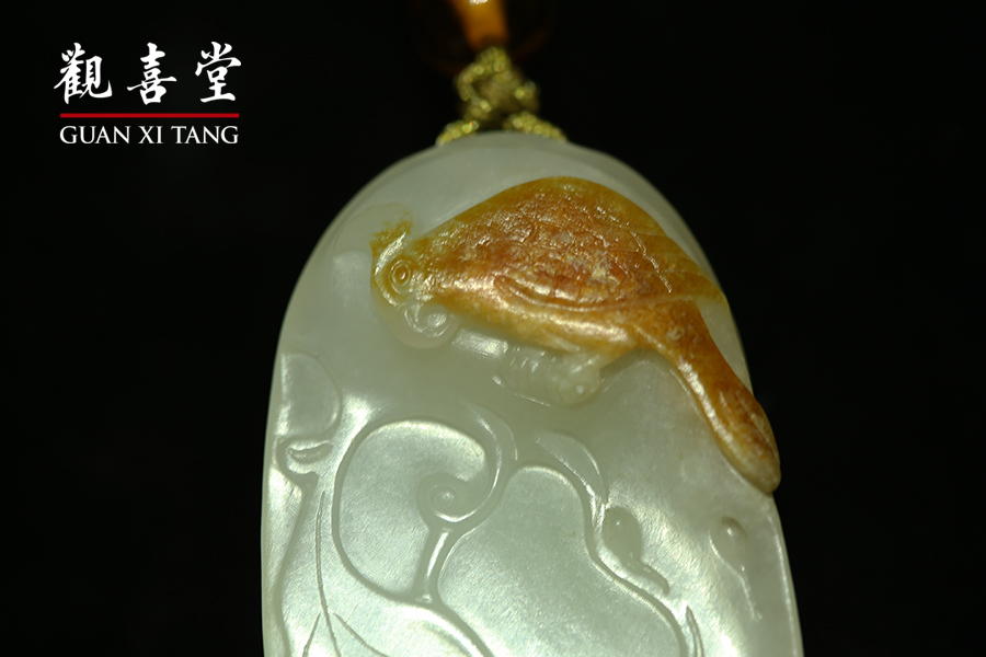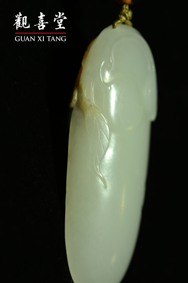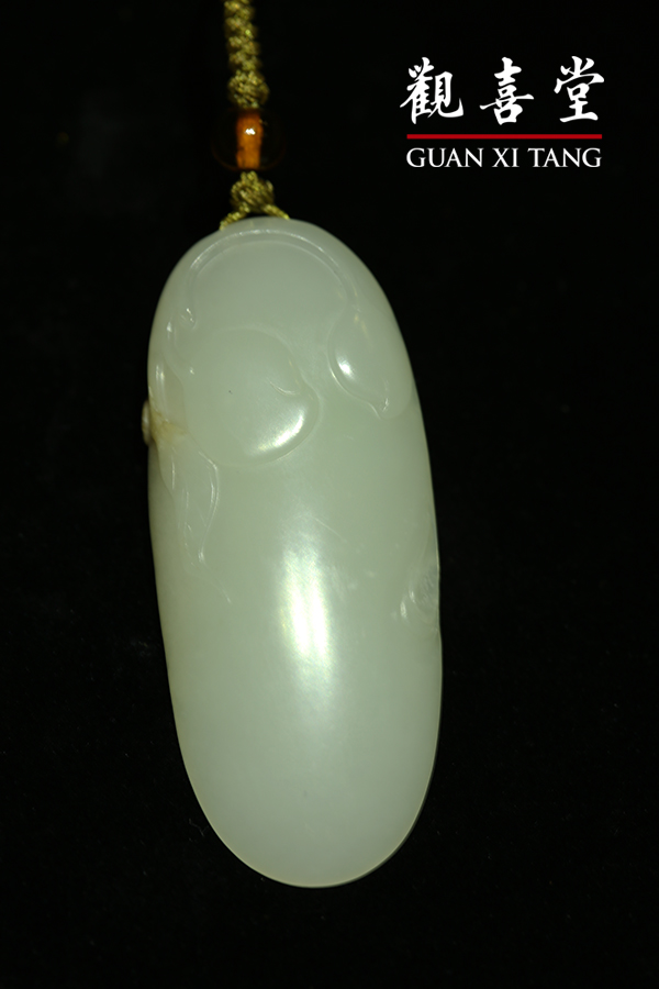 背面續以浮雕出桃葉和兩顆鮮嫩的桃子,垂掛於大面積留白的樹幹,讓玉的光潤質地一覽無遺,潤澤的質感經過把玩後,更可以突顯玉質之美。